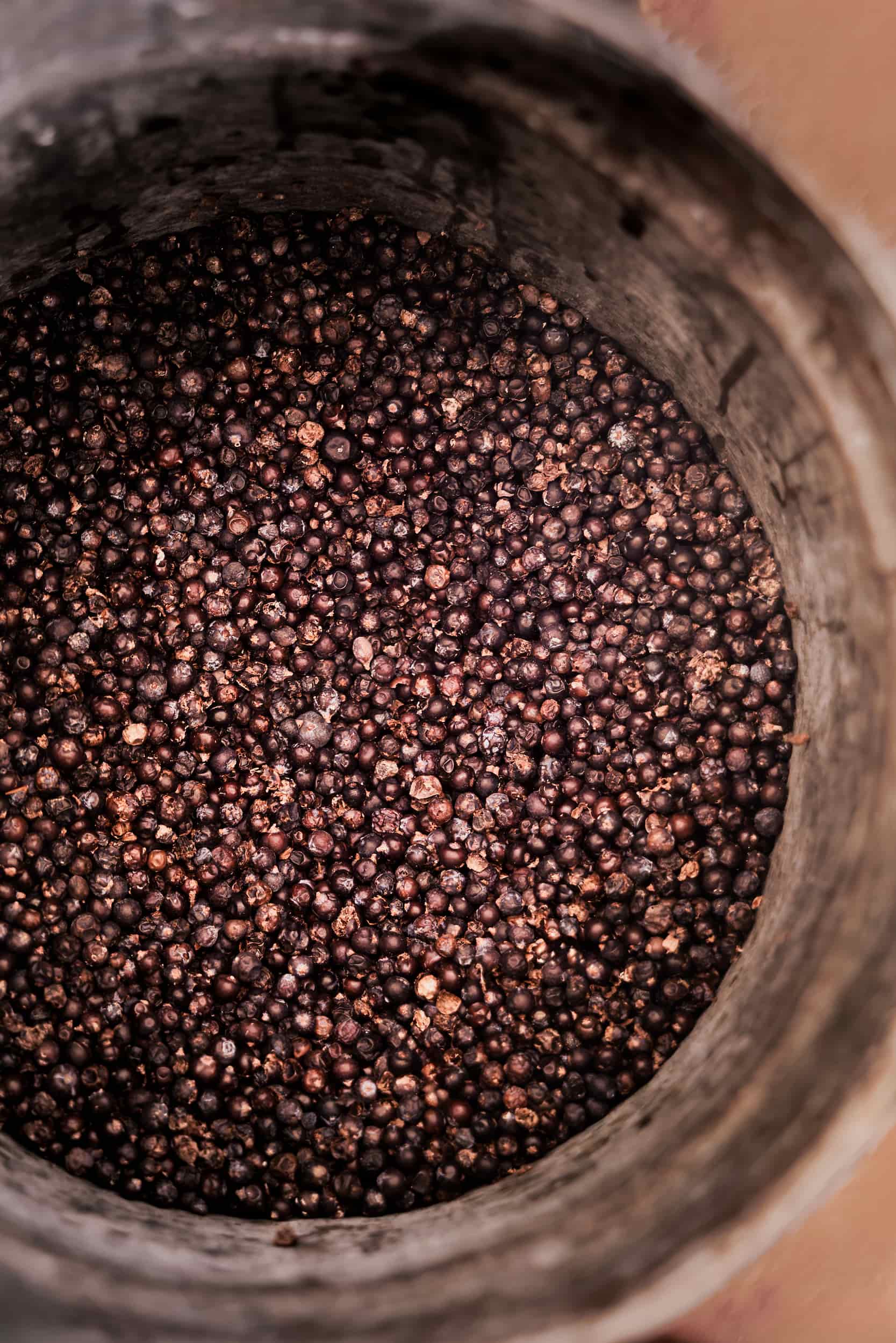 Wild Pyrenean juniper berries, caught in sieves and buckets, glowing under window light. Each one carries the flavour of the island, honest and untamed.